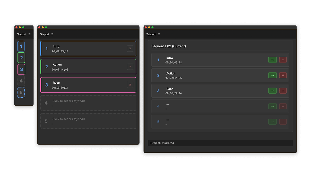 Teleport lets you drop a digital anchor anywhere in your timeline, allowing you to instantly jump back to that exact frame. No more searching for colored markers or memorizing timecodes!