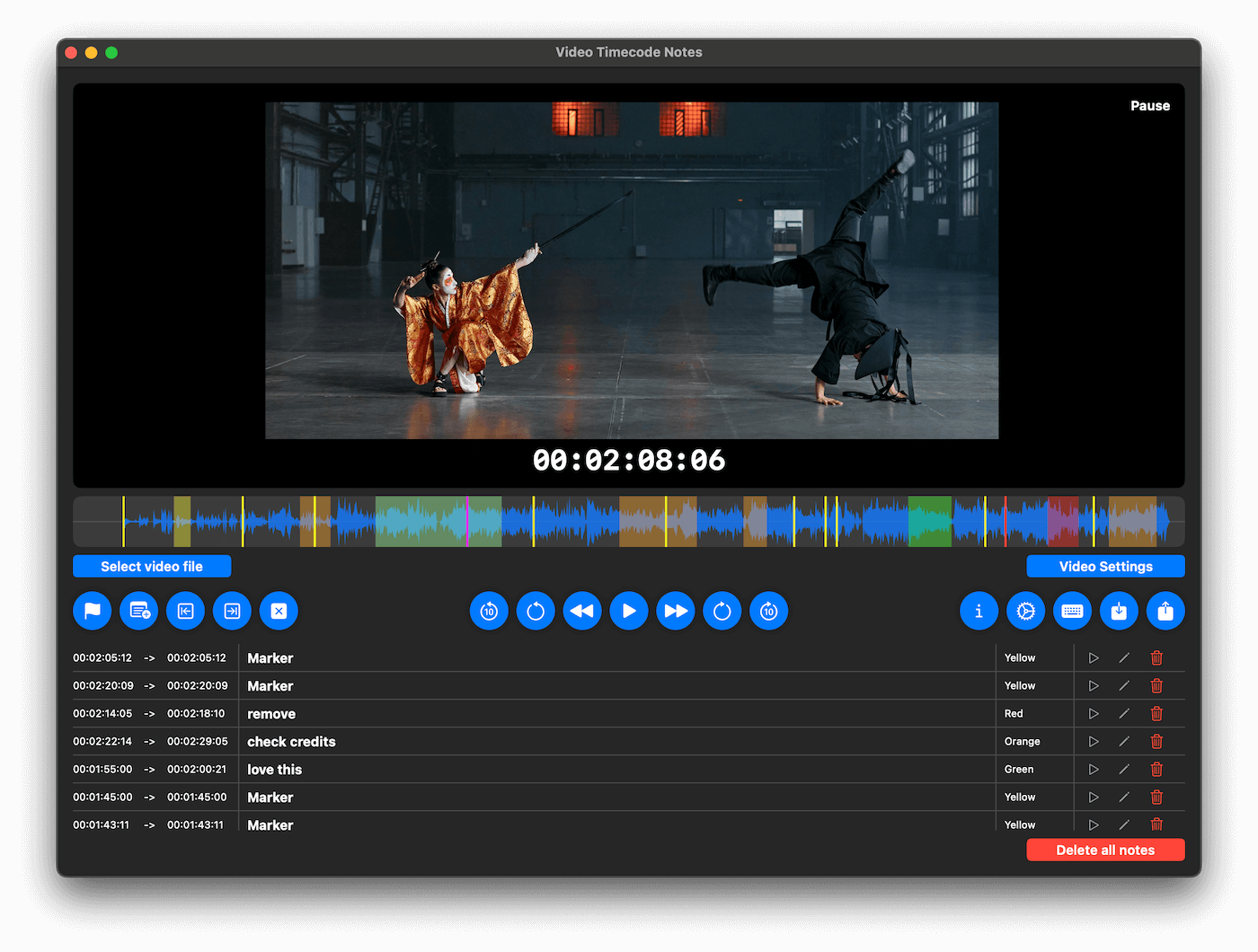 The app stores notes related to files locally, so you can resume logging at any time or switch files during the process. Notes from platforms such as Frame.io can also be imported and merged. The player is easy to handle and can also be controlled with J K L keys to speed up the playback or go slow-motion or backwards. A waveform and all notes are graphically displayed.